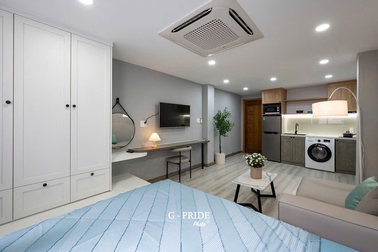 Căn hộ trang bị đầy đủ nội thất: Máy lạnh, tủ lạnh, kệ tủ bếp, tủ quần áo, máy giặt riêng …