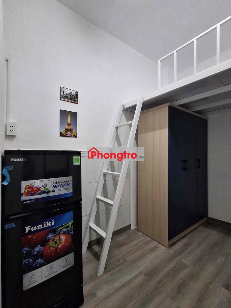 Phòng có. Máy lạnh, tủ lạnh,máy giặc chung, tủ quần áo, gác cao, cửa sổ, bồn rửa chén, gác bếp.