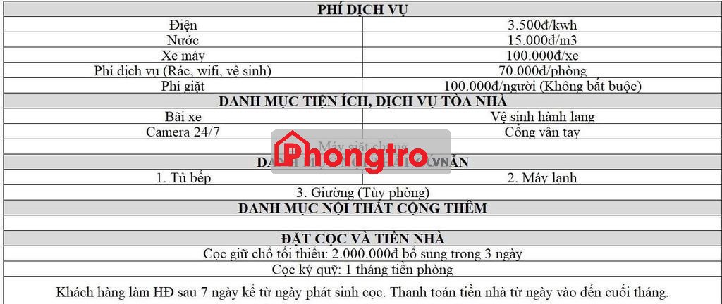 + Chi phí: Điện 3k5, nước 15k, xe 100k, phí dịch vụ 70k/phòng. nếu sử dụng máy giặt là 50k/ng