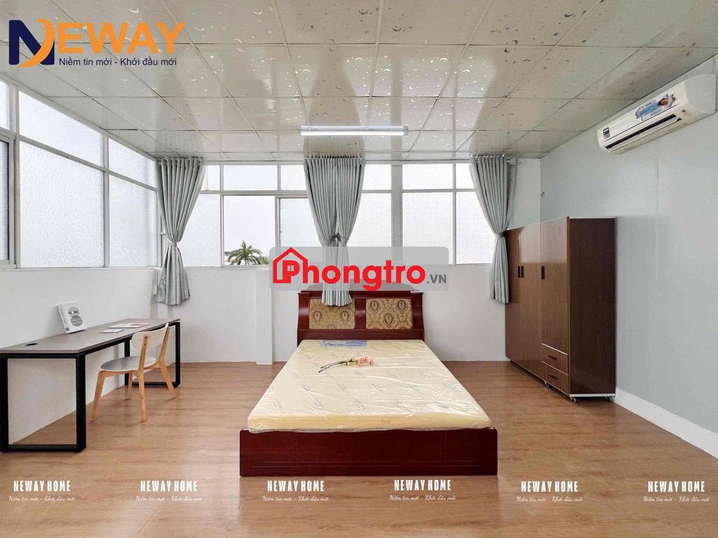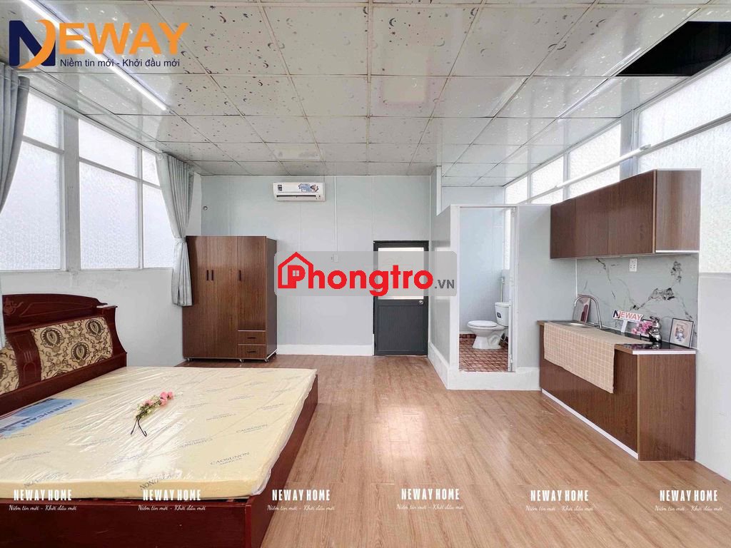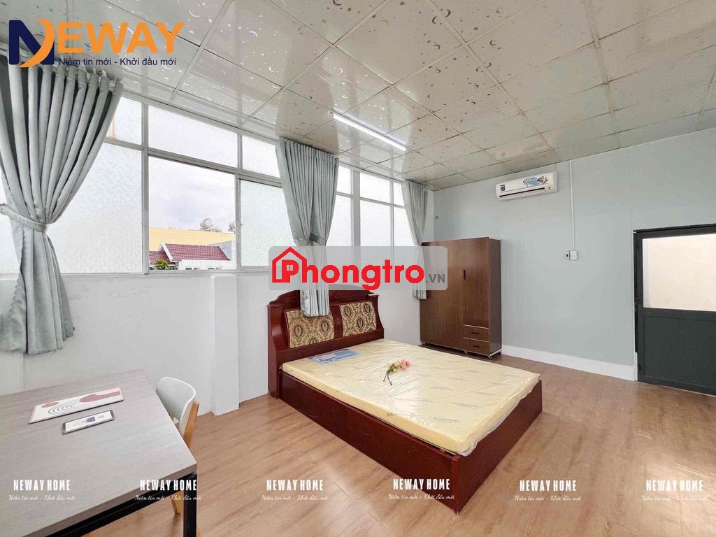 - Phòng trang bị đầy đủ nội thất như: giường, máy lạnh, tủ đồ, kệ bếp, wc riêng, máy nước nóng