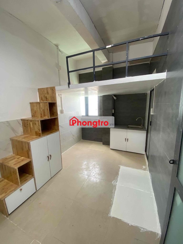Phòng gác cao, máy lạnh, cửa sổ trời lớn, tủ thang, kệ tủ bếp, wc, thang máy