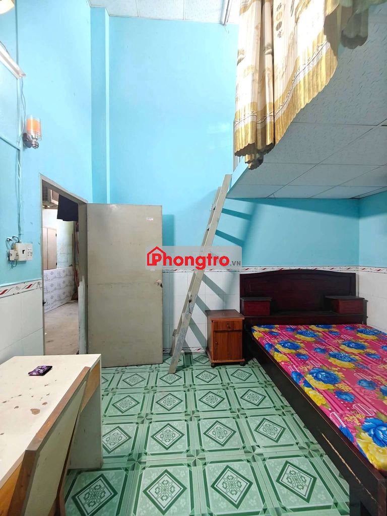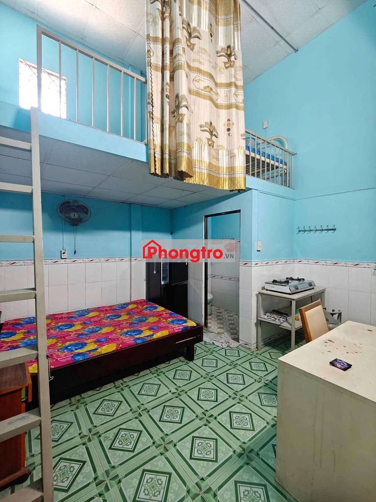 Phòng có gác cao, có nội thất, máy lạnh, quạt, tủ lạnh, giường nệm...