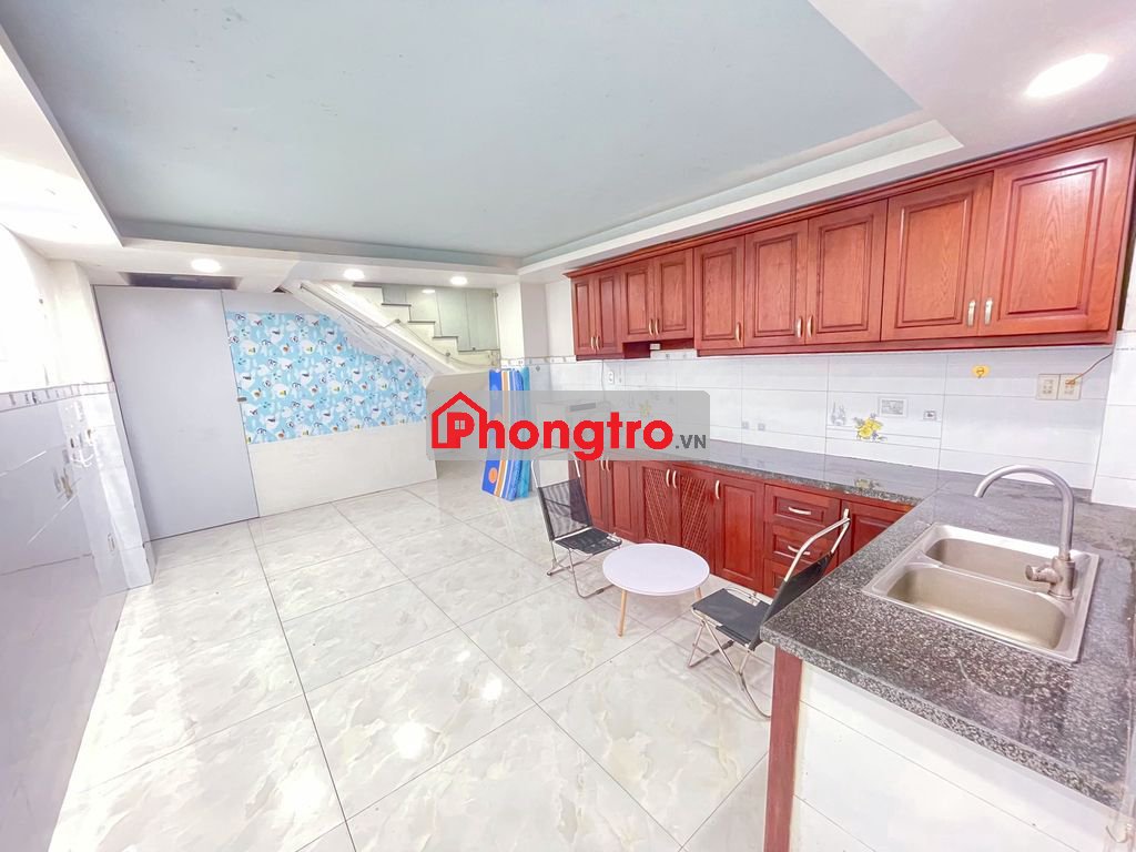 Nội thất: lắp sẵn hệ kệ tủ bếp bằng gỗ dài trên & dưới, gian bàn nấu ăn, bồn rửa chén đôi, nệm, tủ lạnh, bàn ghế