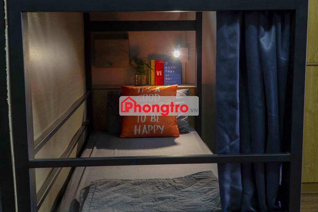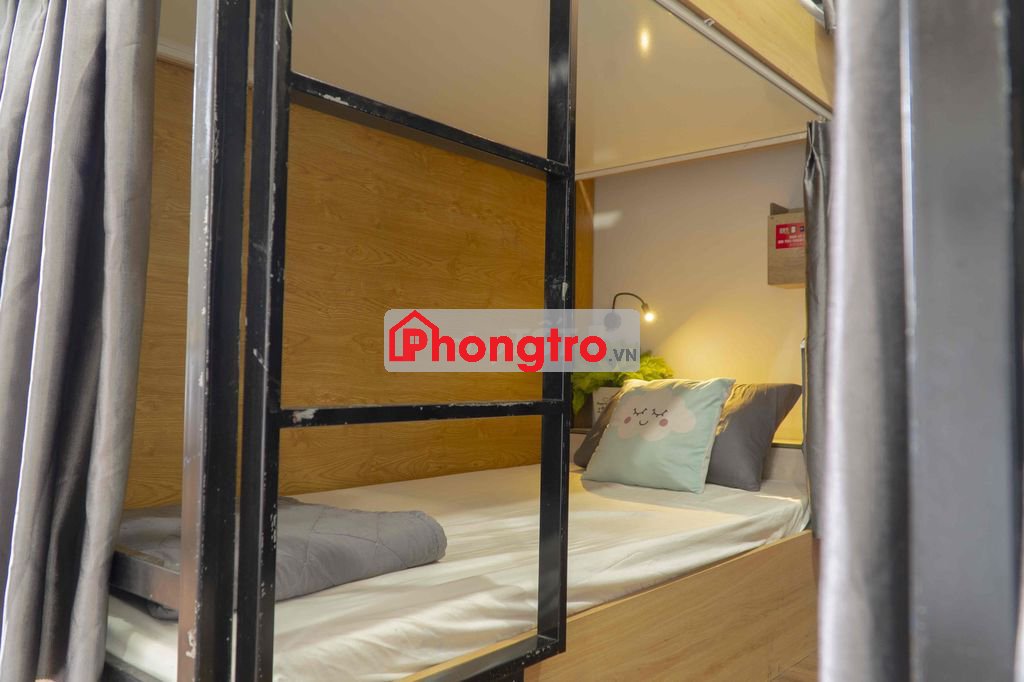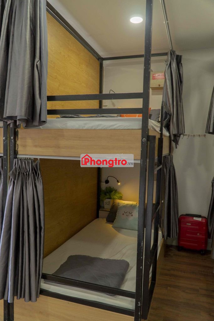 Phòng có máy lạnh, thang máy, giường tầng riêng tư, tủ cá nhân, khu bếp và sinh hoạt chung.