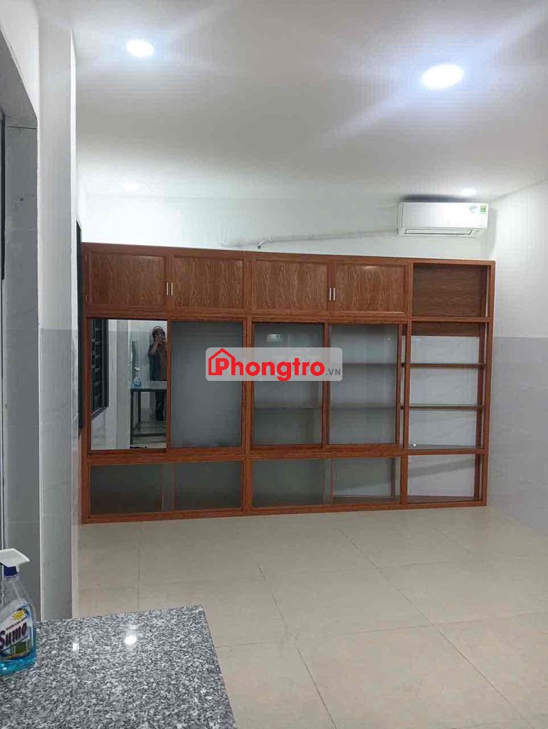 Phòng trọ đầy đủ tiện nghi: bếp, tủ, máy lạnh, toilet, nước nóng bằng năng lượng mặt trời