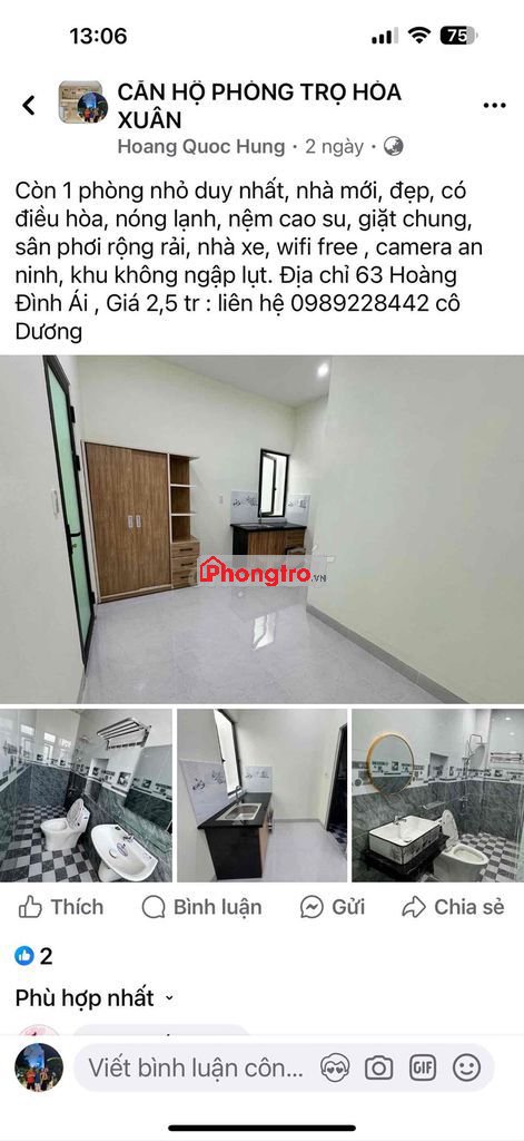 cho thuê phòng trọ 63 đường hoàng đình ái