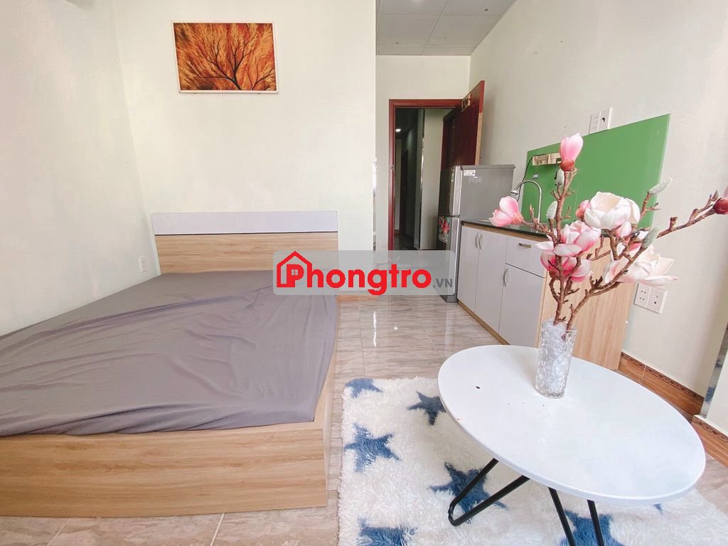 - Phòng trang bị đầy đủ nội thất: Giường, nệm, máy lạnh, tủ lạnh, kệ bếp
