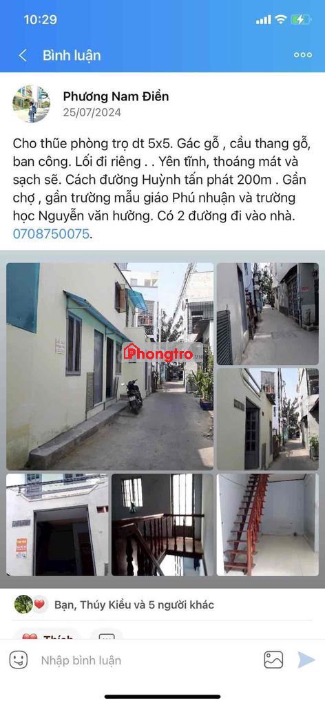 Cho thuê phòng trọ diện tích 5x5. Gác gỗ , cầu thang gố , có ban công . Lối di riêng .Yên tỉnh , thoáng mát , sạch sẽ .Cách đường Huỳnh Tấn Phát 200m .Gần chợ , gần trường mẫu giáo PHú Thuận và trường tiểu học Nguyễn VĂn Hưởng .Có 2 hẽm đi vào nhà .ĐT ***