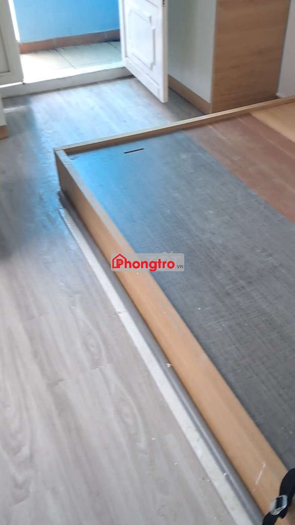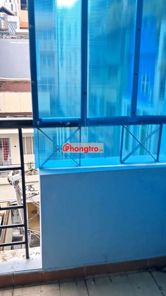 Phòng mới xây đầy đủ nội thất: có máy lạnh, tủ lạnh, giường, cửa sổ, ban công thoáng mát