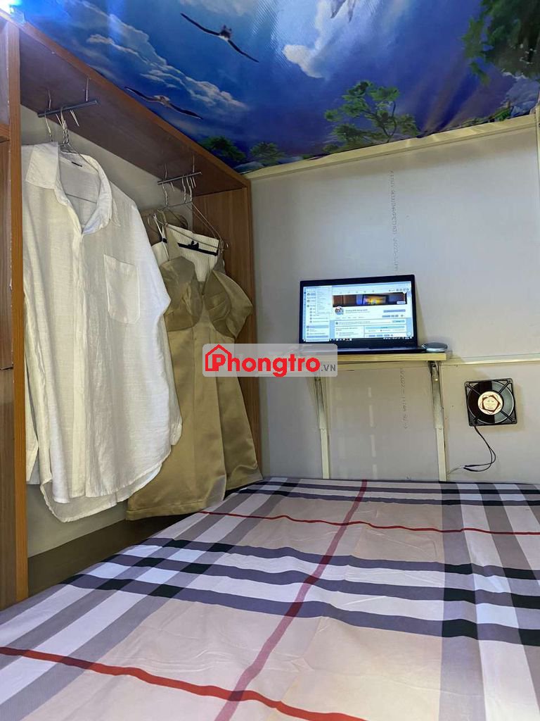 ĐỦ NỘI THẤT: Tủ treo quần áo, kệ sách, bàn học, gương trang điểm, đèn, quạt, ổ cắm điện, hộc để giày và valy bên trong. Có sẵn nệm, drap, mền, gối và 5 cái mắc áo miễn phí.