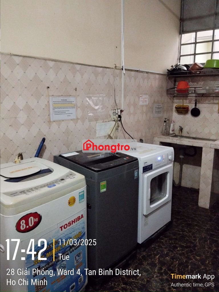 Có máy giặt, máy sấy dùng chung, khu vực phơi đồ, khu vực nấu ăn riêng, có nv vệ sinh hàng tuần.