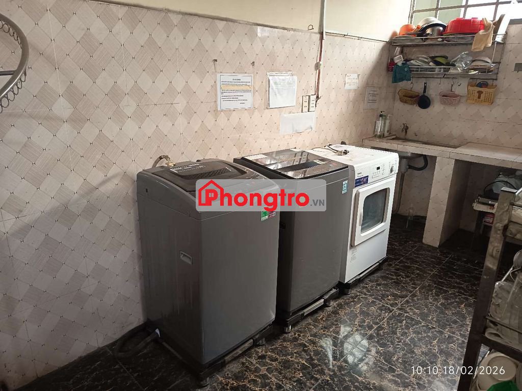 Có máy giặt, máy sấy dùng chung, khu vực phơi đồ, khu vực nấu ăn riêng, có nv vệ sinh hàng tuần.