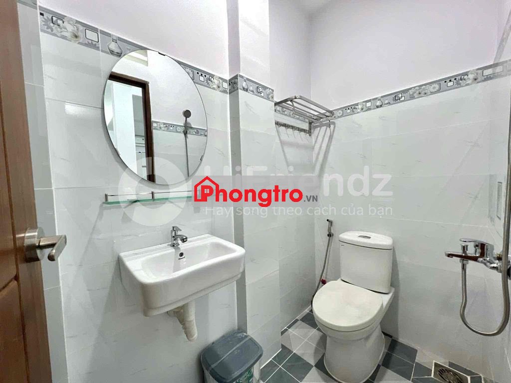 • Phòng tắm khép kín: WC riêng sạch sẽ, ốp lát gạch trắng viền họa tiết, có Gương tròn và đầy đủ thiết bị vệ sinh.