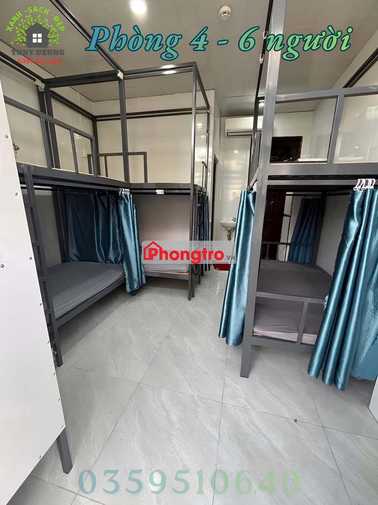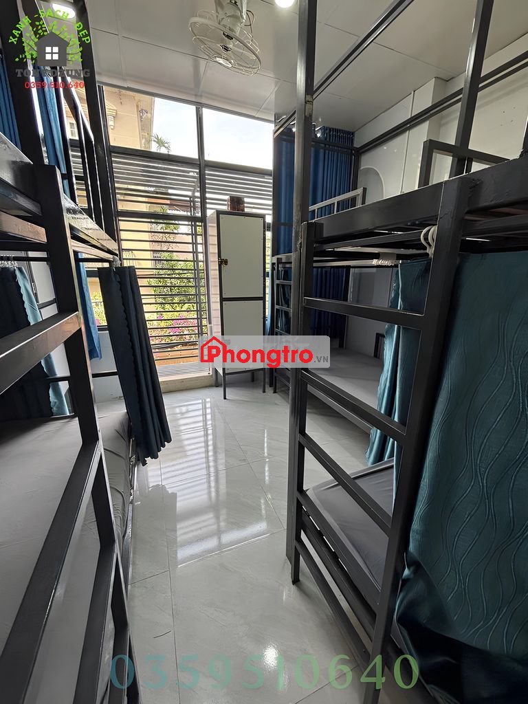 - Nội thất đầy đủ: giường tầng chắc chắn, nệm, drap, gối nằm, tủ lạnh, tủ quần áo, rèm che riêng tư.