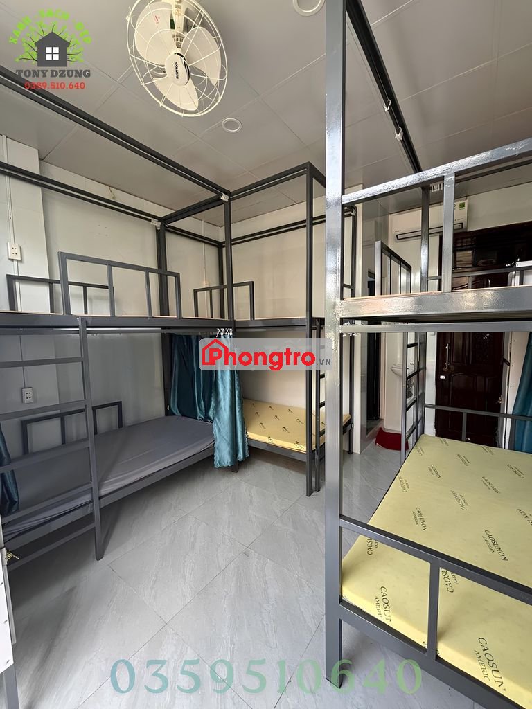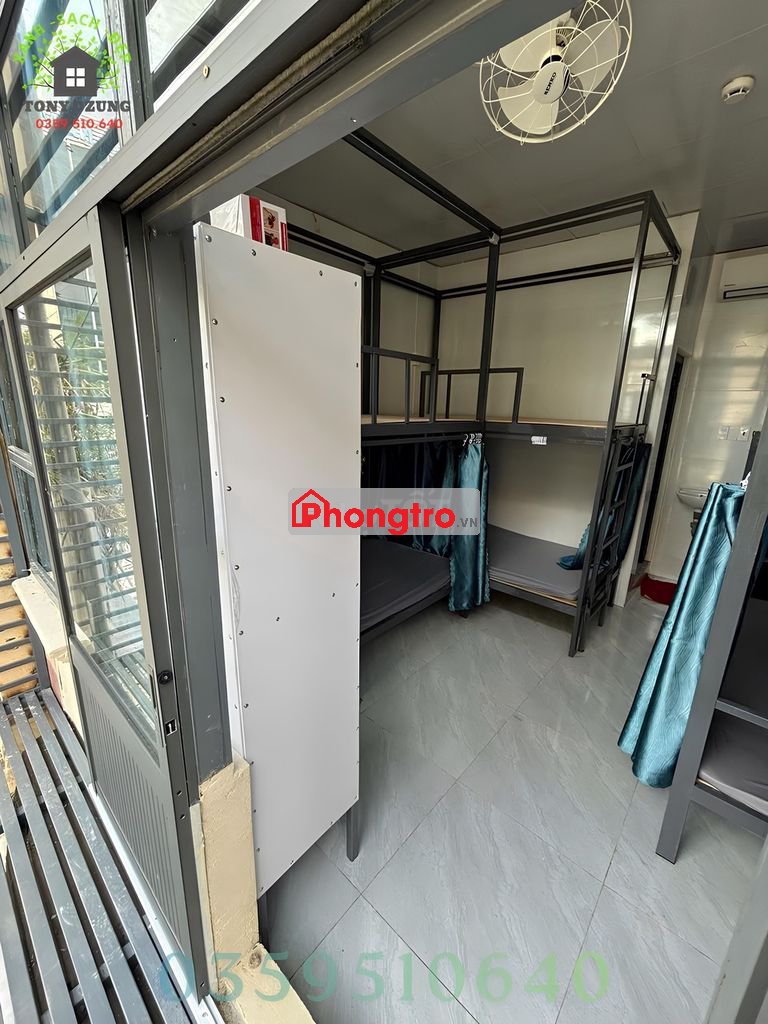 - Nội thất đầy đủ: giường tầng chắc chắn, nệm, drap, gối nằm, tủ lạnh, tủ quần áo, rèm che riêng tư.