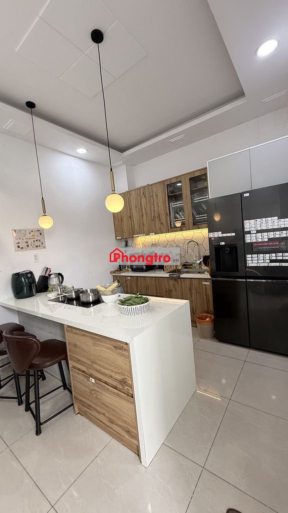 Bếp riêng biệt: có tủ lạnh, quạt, bàn ghế, máy lọc nước, khu vực nấu ăn sạch sẽ.