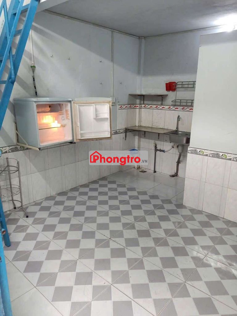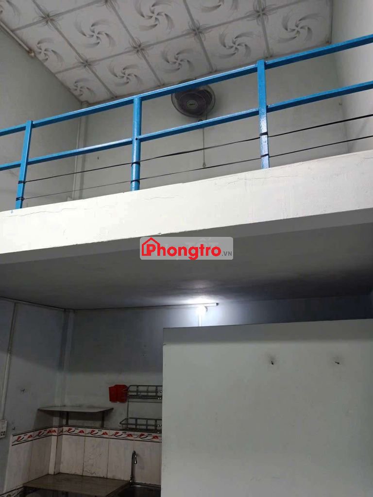 Phòng có gác lửng, nhà vệ sinh, bồn rửa, tủ lạnh mini, quạt.